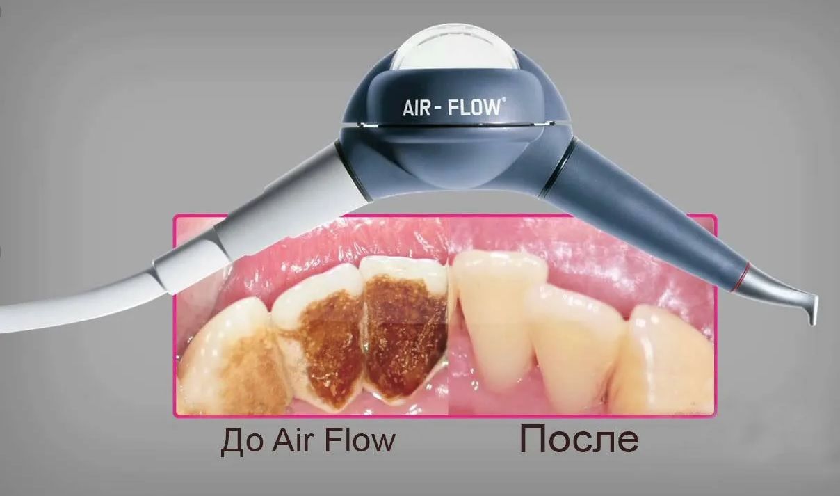 " Air Flow" переводится как "воздушный поток" и описывает суть процедуры.Пескоструйной она называется потому,что вместе с потоком воздуха подается смесь воды и мелких частиц соды.Эмаль проходит обработку " колючим" составом,сметающим налет с ее поверхности.