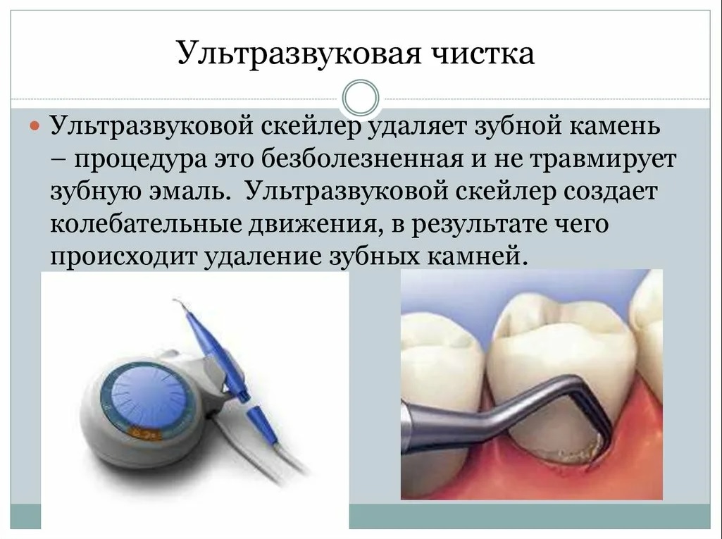 При отсутствии противопоказаний и массивном слое зубных отложений их снимают с помощью ультразвука.Врач подбирает подходящую насадку и оптимальный режим работы УЗ-скалера в соответствии с масштабом нелета и начинает двигать наконечником по поверхности зубов.